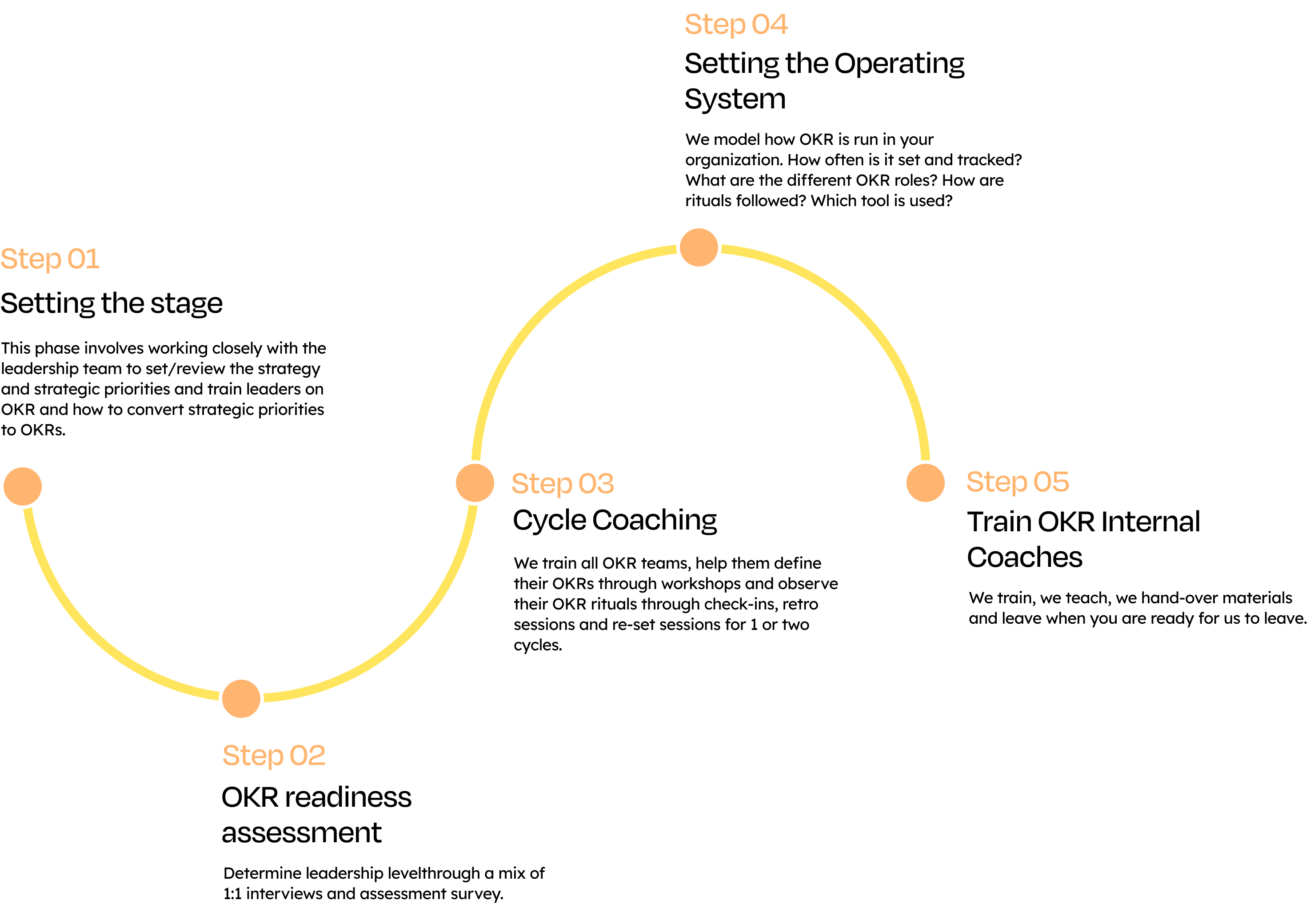 OKR Coaches training is crucial for companies at this stage to minimize external dependency and ensure self-managing OKR teams. We train, we teach, we deliver materials, and when you're ready we hand over the whole process to your OKR coaches.